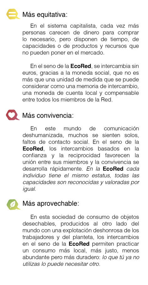 La Ecored es una red comarcal de intercambio de bienes, servicios y conocimientos mediante una moneda social. Es una herramienta de transición hacia una forma de vivir diferente, basada en la cooperación, la libertad y la responsabilidad entre las personas y nuestro medio ambiente.